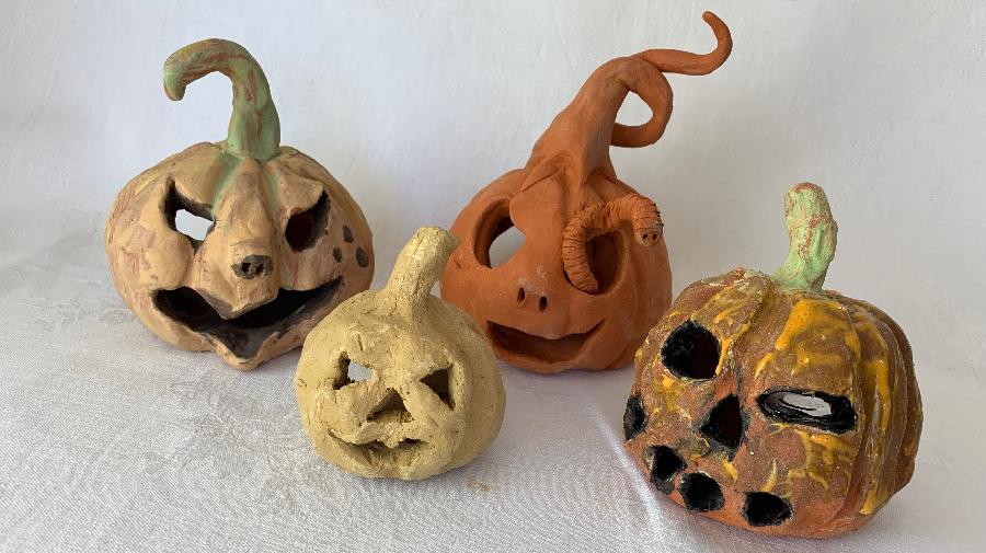 Gemeinsam gestalten die Kinder aus Ton individuelle, gruselige oder witzige Kürbisleuten, die mit einem Teelicht zum Leuchten gebracht werden.