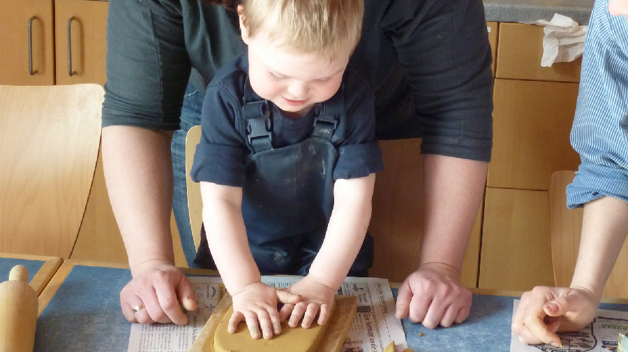 Die Kinder erleben spielerisch die Unterschiede zwischen verschiedenen Materialien wie Wasser, Stroh, Steinen und Lehm. Die Eltern stellen anschließend einen kleinen Feierabendziegel her, in den die Kinder ihren Fuß oder ihre Hand drücken dürfen.