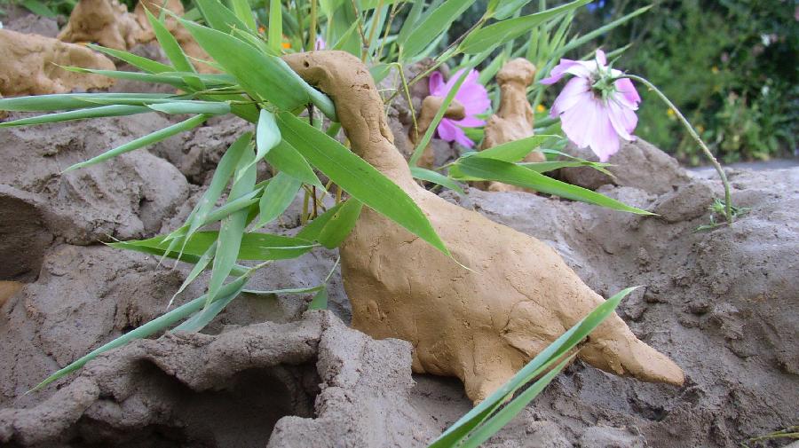 Aus Ton und Lehm lassen Kinder Höhlen, Berge und Täler entstehen. Diese werden dann von großen und kleinen Dinosauriern bevölkert.