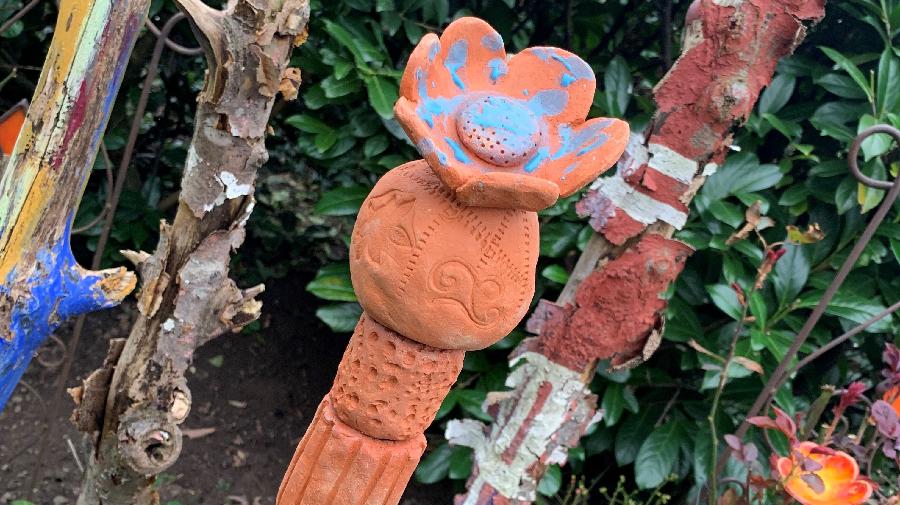 Gemeinsam mit der Museumspädagogin töpfern Kinder bunte, kreative und ausgefallene Objekte, die nach dem Brand den Garten schmücken.